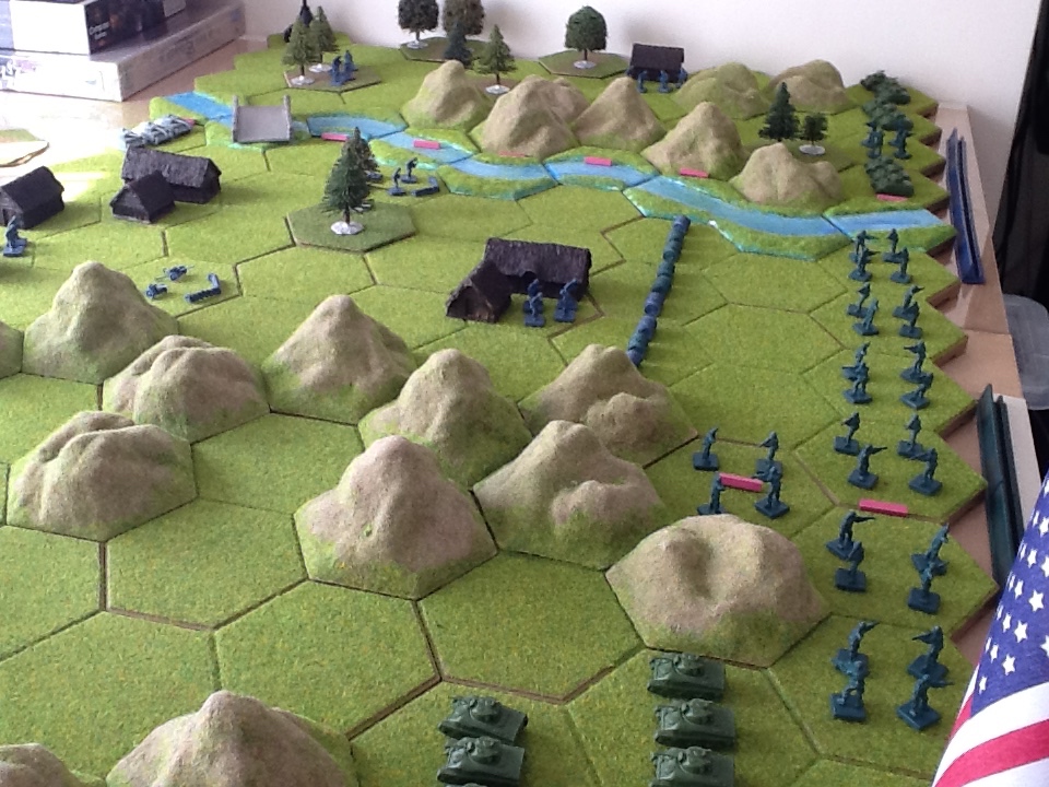 I have set up the first Memoir 44 board game scenario using Kallistra called "Pegasus Bridge" for a game. [The scenario uses Green American playing pieces to represent the airborne troops.]