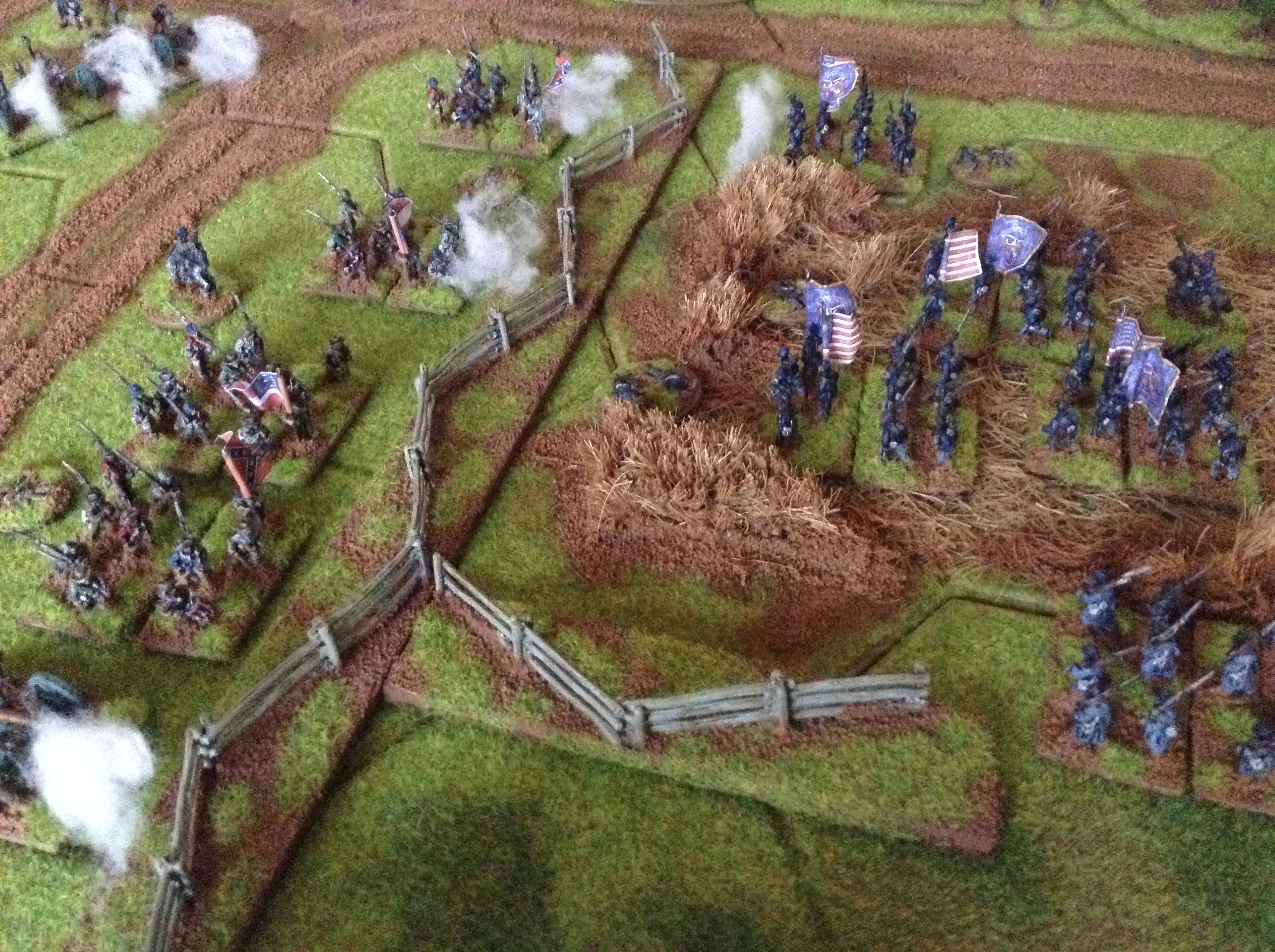Hood's crack troops, Texans, charge into action and push the beleagered Union units back, being A class troops with some high dice rolls!