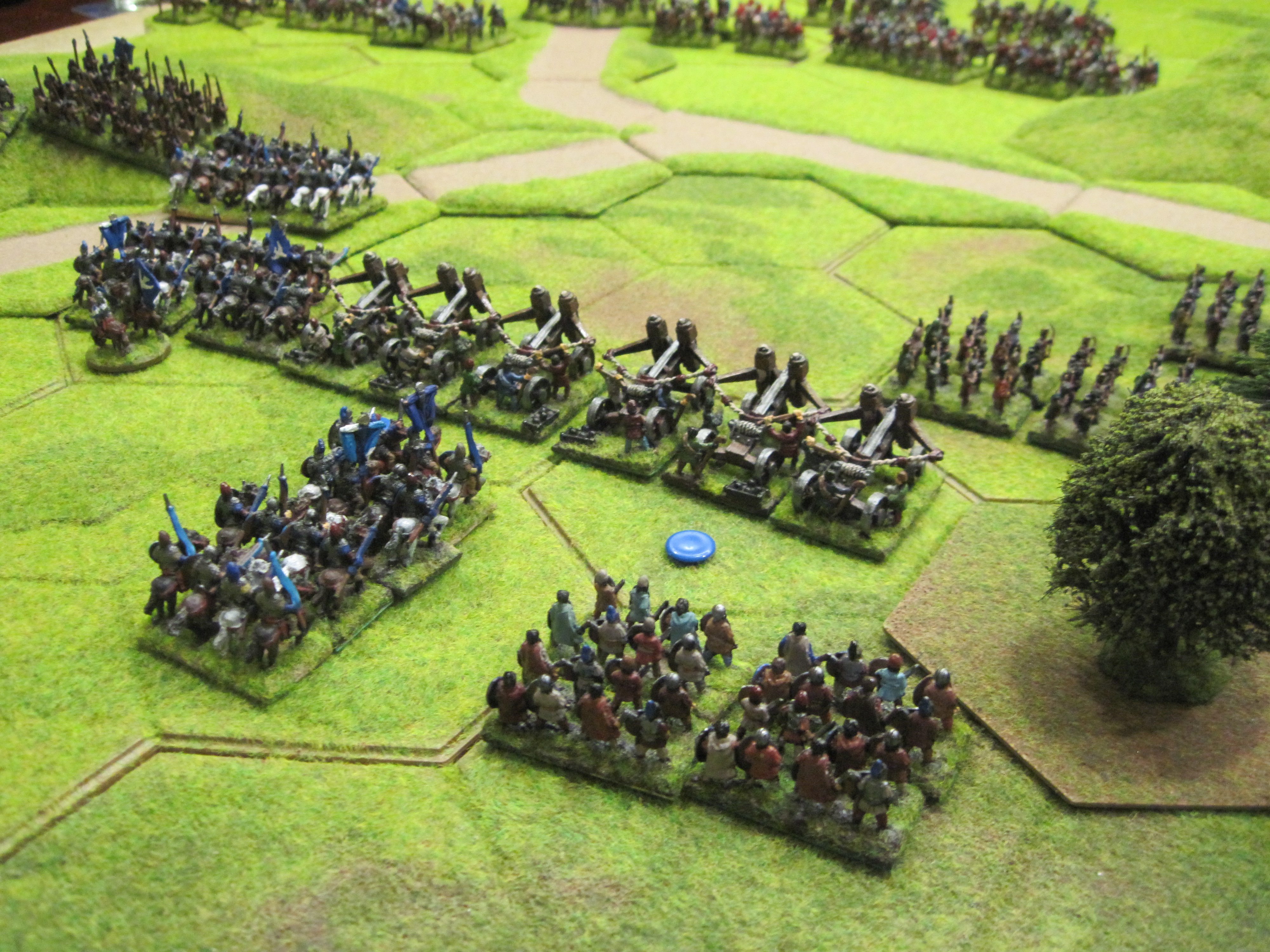 Between us Brits, we agreed a policy of letting them come to us and launch a counter-attack when the opportunity arose. This policy lasted approximately 3 minutes! Mick, in command of our left wing insisted on advancing his infantry forward, pushing one unit into a very exposed, unsupported position. Despite Tim and my protestations, Mick insisted that he knew what he was doing! This provided a ‘worm on a hook’ for Steve and Tony who couldn’t resist taking out this exposed unit of infantry with their cavalry. The attack went against our left wing in force and without some urgent response we were facing a very swift defeat.