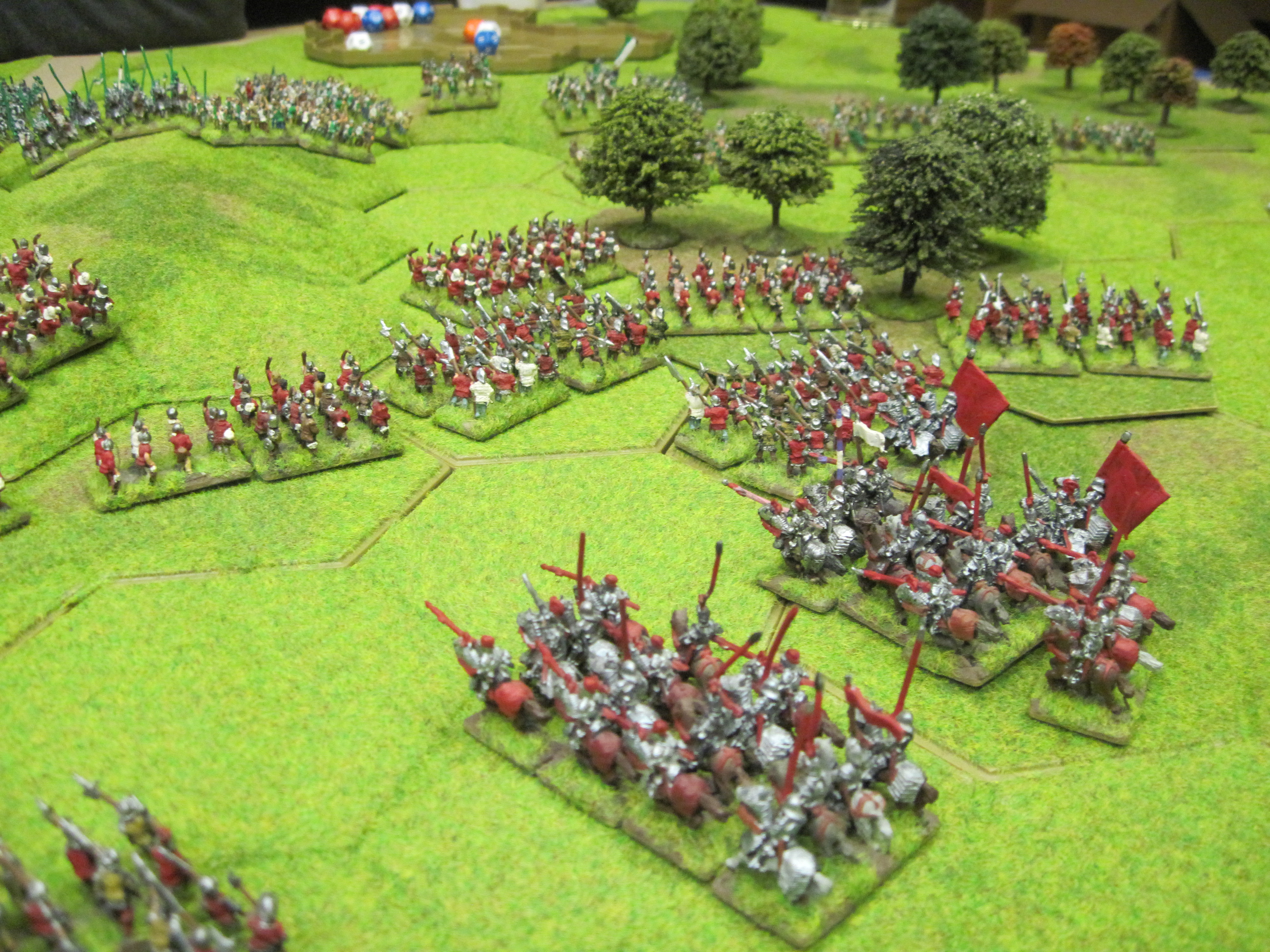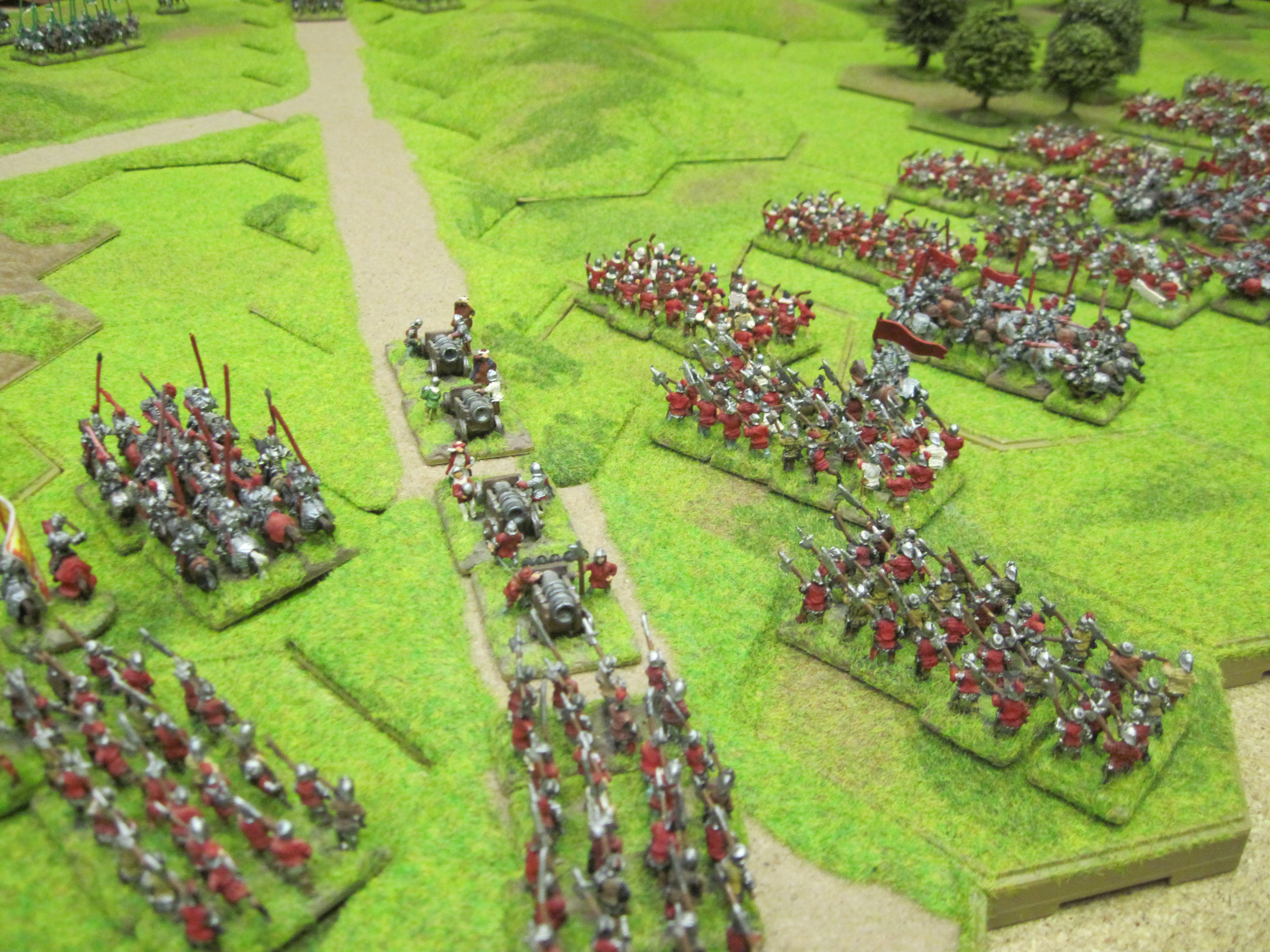 Meanwhile in the centre I tried to make preparations for the expected charge of the Tudor mounted me-at-arms, trying to work out when and where the impact would fall. Tony with plenty of cavalry at his disposal is a very dangerous combination and if we were caught off guard it would soon be game over! Thankfully, the broken ground to our left in which we placed bill and bow units, the heavy guns pointing down the road and a line of longbow units ready to shoot at anything coming over the 8 hex hill would and did provide stubborn resistance.