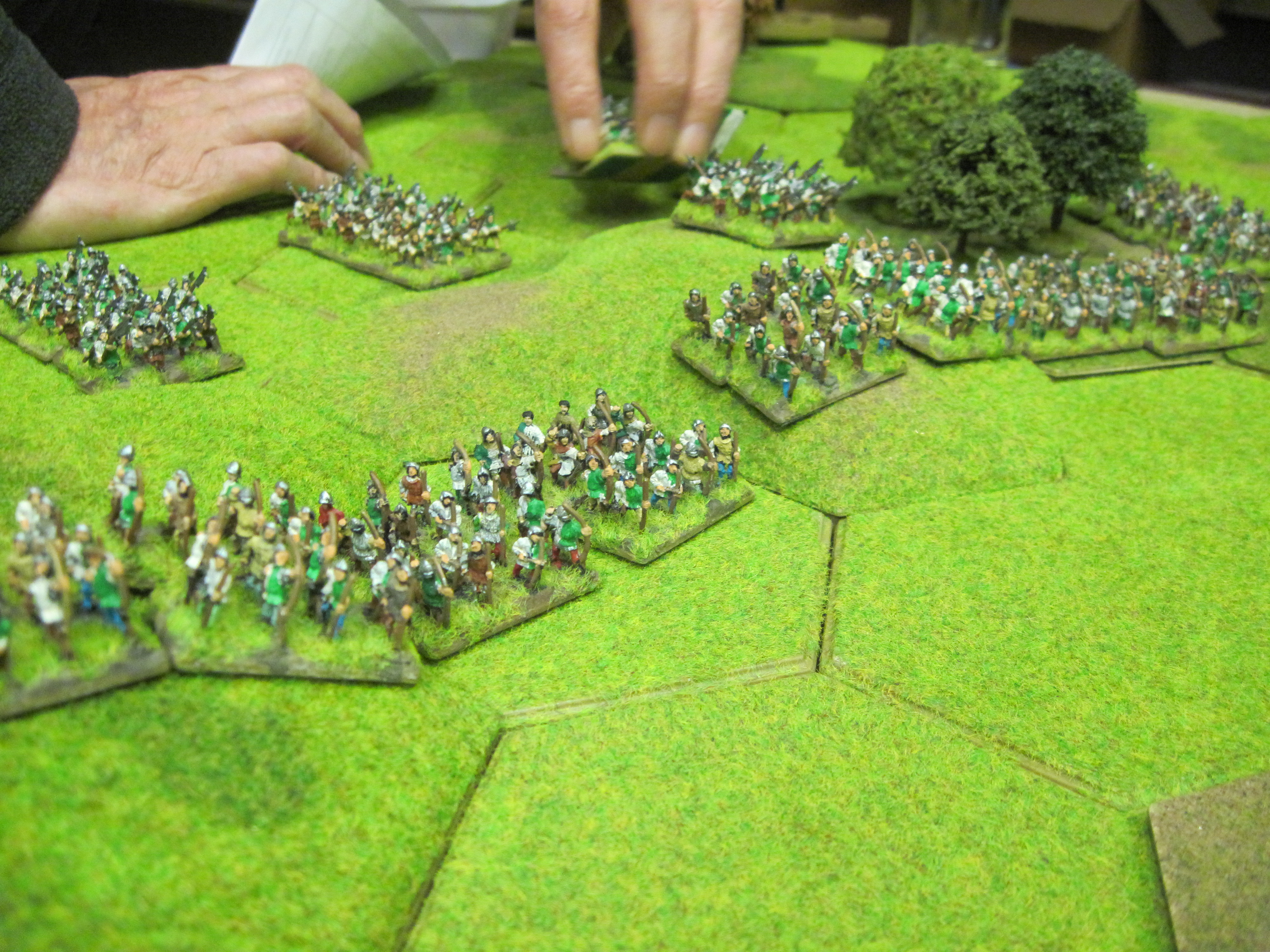 Opening moves saw the Tudor infantry advance towards Leo’s infantry on our right where we quickly occupied a 4 hex wood for protection from longbow shooting. We needed to keep control of this small area woodland as a bastion against flank attacks against our right wing. In a couple of moves it became obvious that the Tudor infantry were determined to take it from us. Leo’s Longbow units were eventually forced back through the wood but did put up a hell of a fight.