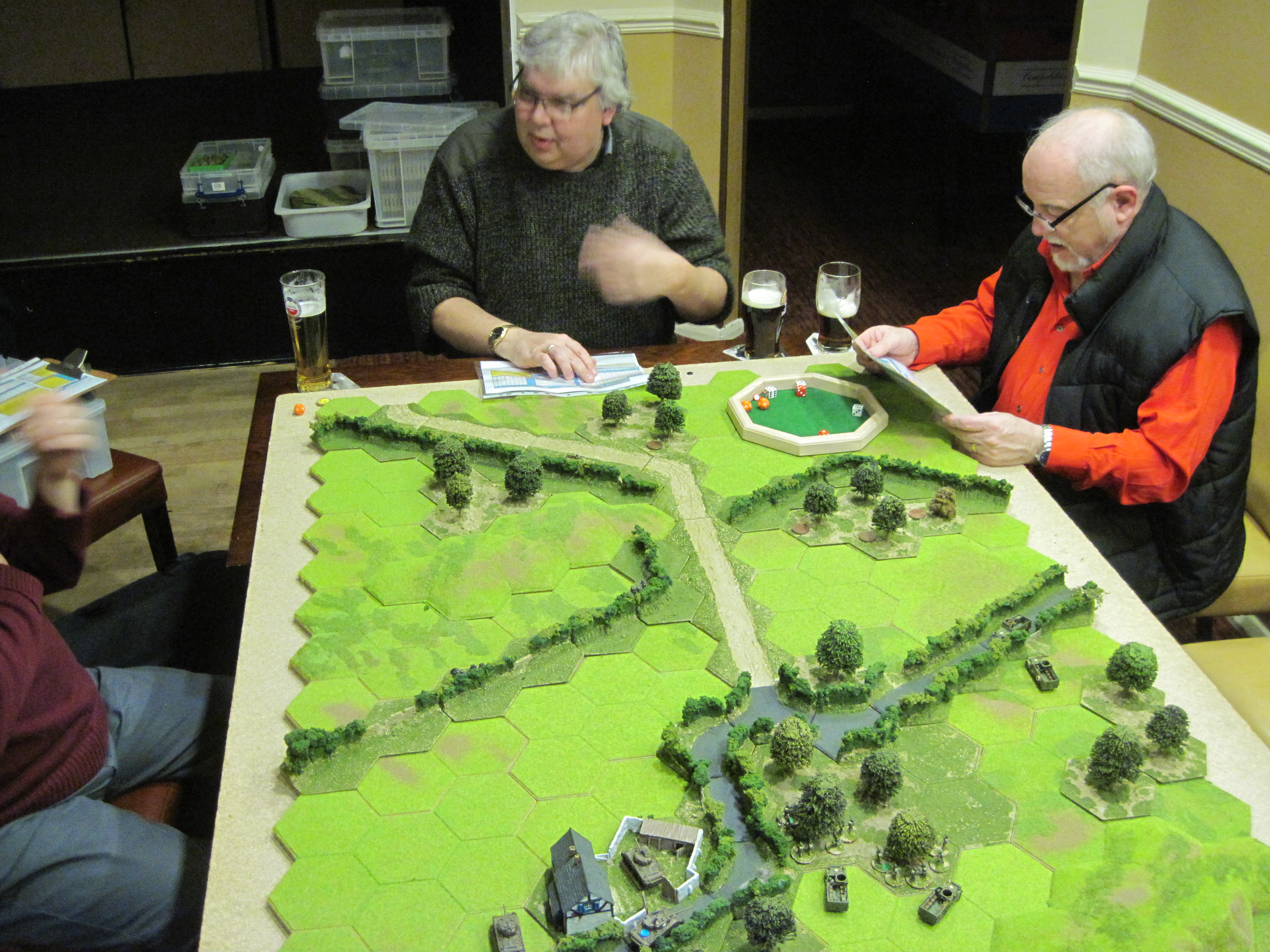 Tony and Steve were in command of the German forces and Dave Mac had the roll of game moderator, which in this type of scenario was a very important roll. The German units were identified with markers placed in particular hexes, but some of these markers were ‘dummies’ which was a great way of making Tim and I guess which ones were ‘real.’