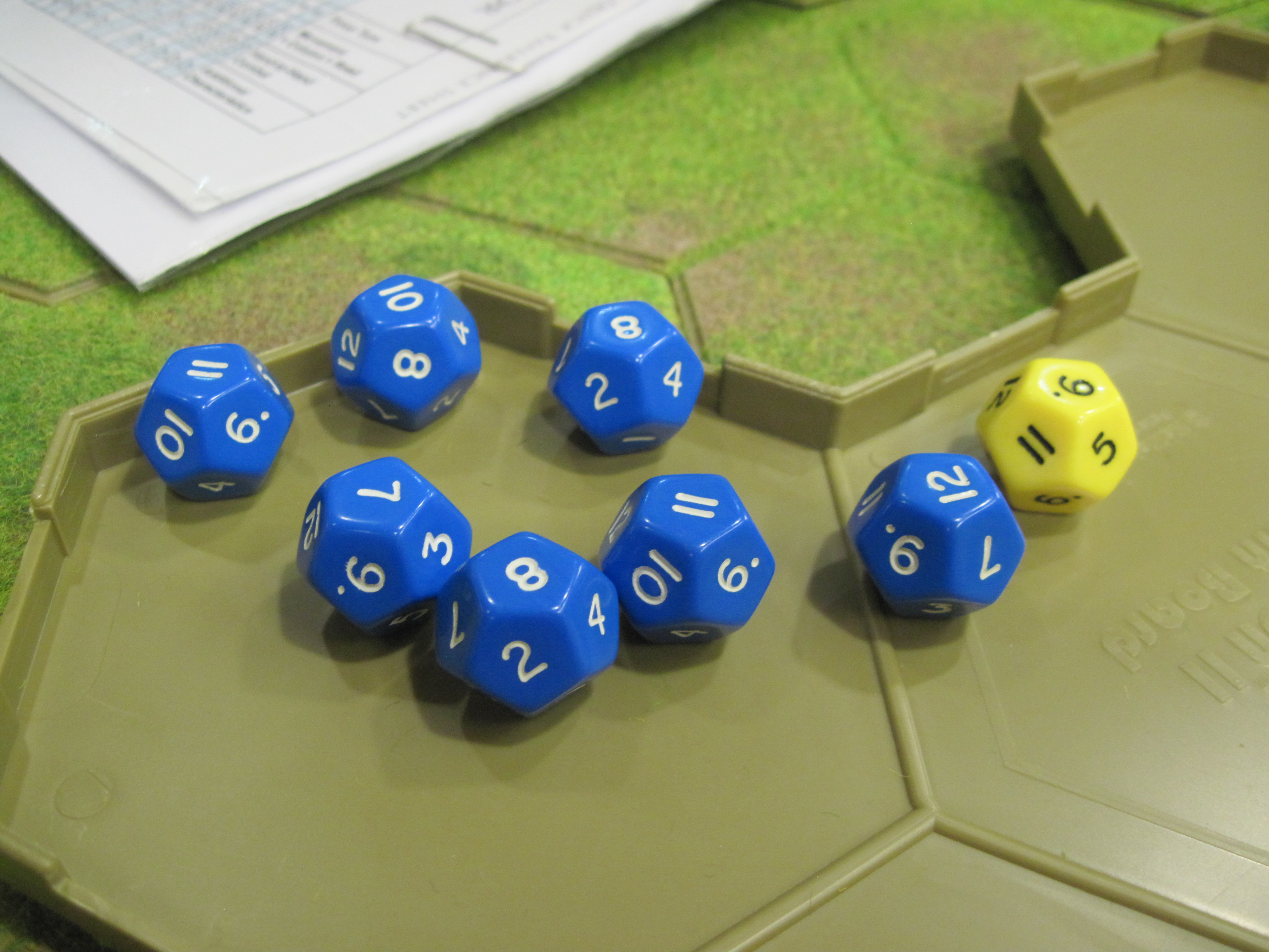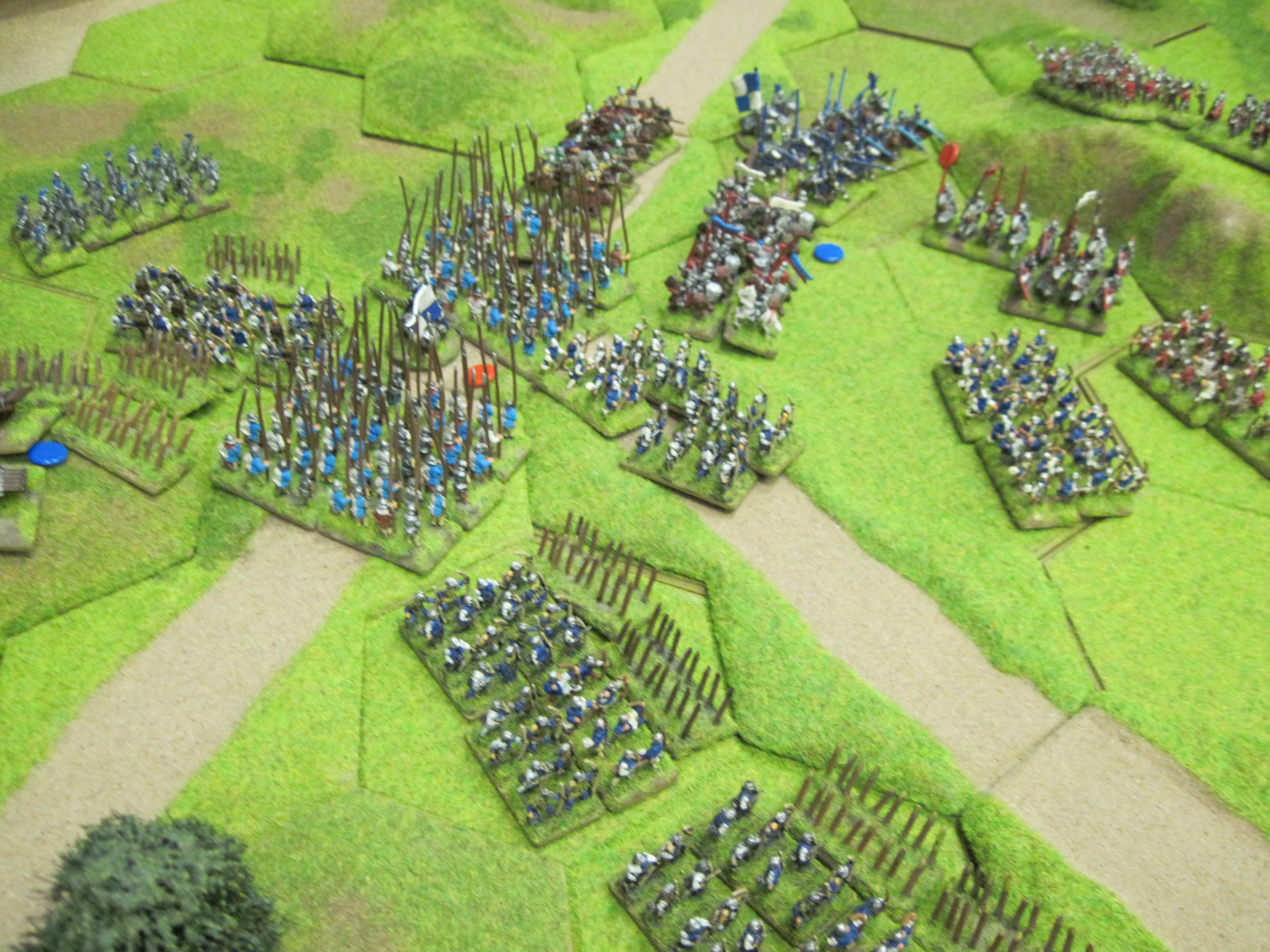 With three players on each side, all with different ideas on the best tactics with reference to the terrain and deployment, this was certainly a game of ‘generalship by committee!’ Both armies chose to deploy just about as far away from each other as the 6ft x 4ft table would allow. This resulted in the Yorkist army (in blue), which had fewer cavalry and was less mobile adopting a strong defensive line at a 45 degree angle across the table. This left the Lancastrians (red), advanced to occupy an 8 hex escarpment with its steep face directly facing the Yorkist defensive line.