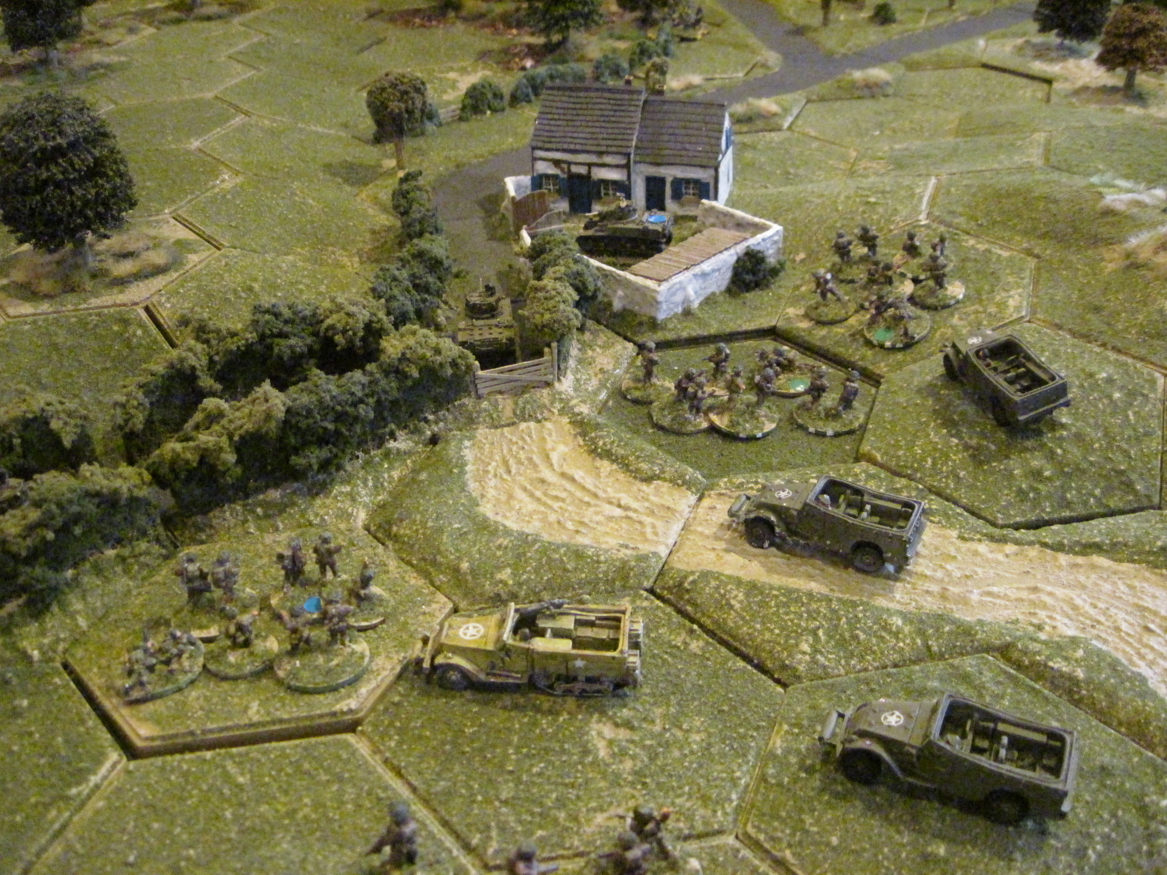 All German units were on ‘ambush orders’ and so as Chris and I pushed our Stuart tanks and M3 halftracks forward we expected to be fired upon by concealed German assets. I pushed quickly into the small village without contacting any resistance and positioned one of the Stuart tanks to block the road between the bocage hedge. Soon a Stug IV appeared and after a ‘lucky’ close range hit the Stuart popped it and in doing so cut one of the six escape routes.